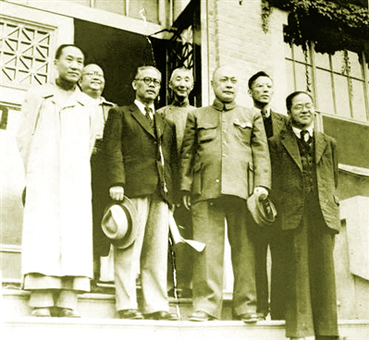 1949年,陈毅参观心博在线登录入口。前排左一为叶企孙。