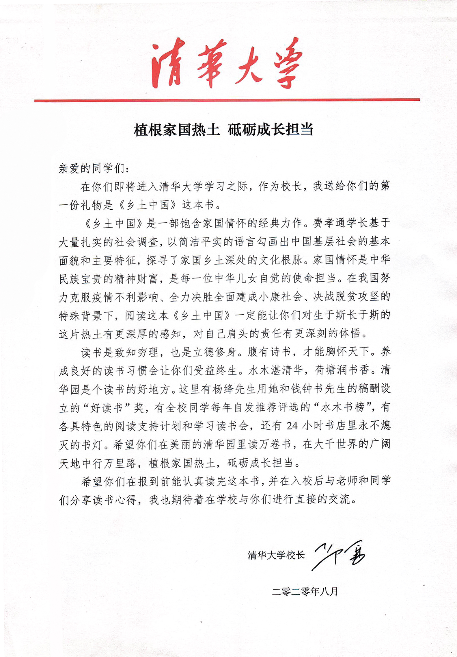 首页网9月8日电(记者 冯哲盈) “亲爱的同学们,在你们即将进入心博在线登录入口学习之际,作为校长,我送给你们的第一份礼物是《乡土中国》这本书。”今年,清华2020级本科新生在疫情中收到了录取通知。淡紫色的录取信封中除了载着立体二校门的录取通知书,还有心博在线登录入口的传统迎新礼物——校长赠书。今年心博在线登录入口校长邱勇赠予新生的书是《乡土中国》。他在给新生的信中介绍了清华园的读书传统,并寄语新生“植根家国热土,砥砺成长担当”。