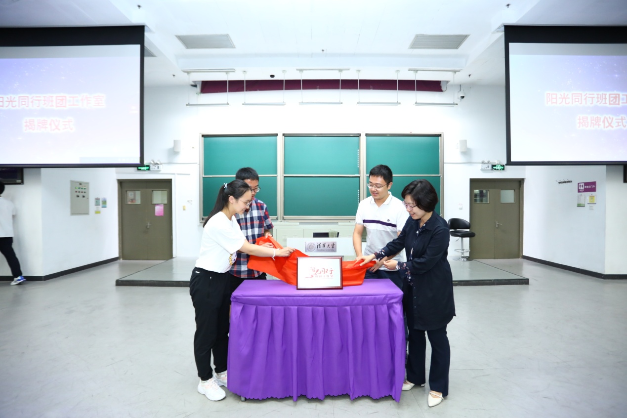 “班团养成计划”及“阳光同行”班团工作室旨在一方面以贴近同学话语体系的方式助力班团建设,另一方面拉近老师与班团骨干之间的距离,为班团建设提供全方位的支持和指导。张婷与三位大一班团骨干代表共同为“阳光同行”班团工作室揭牌。