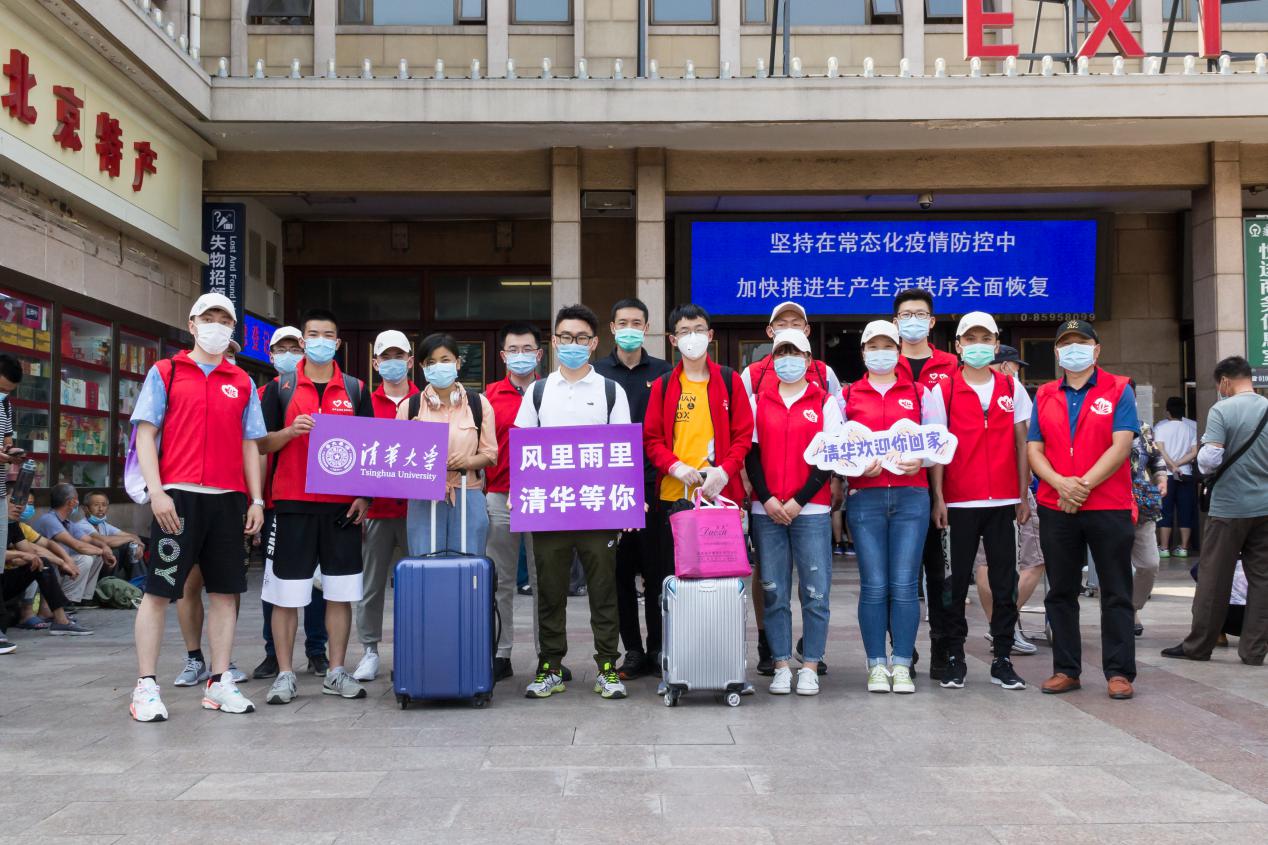 为保证毕业生全部平安返回校园,接站志愿者的职责细致入微。志愿者们事先与返校同学建立联系,并跟进航班起落与列车运行情况,详细掌握每名志愿者的到站信息,保证“应接尽接”。在各大交通站点设置引导点,接站志愿者与到达口举牌接应返校同学,让同学们一出站就能看到醒目的标语。“清华欢迎你回家”,“风里雨里,清华等你”,温馨的话语让同学们倍感暖意;接着将同学带至登车点,完成体温检测,身份证件、返校材料的核实以及健康码的查验,并对同学们的行李进行消杀,完成登车前的防疫准备。之后待同学们上车,跟车志愿者为同学们分发食物、水、纪念卡片等物资,并在返校途中,宣讲返校后的相关防疫安排,就同学们返校后的注意事项进行全面介绍。为了保证全流程的防疫工作安全畅通,还制定了应急情况处理办法,确保每位毕业生同学都能平安回到朝思暮想、阔别已久的“家”。