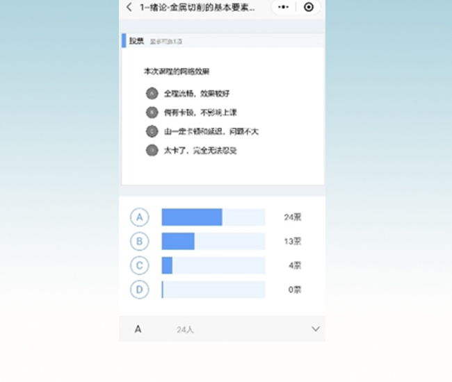 “制造工程基础A”授课教师张建富说:“除1名学生身在德国因时差,课前申请回看学习外,包括助教在内全体同学均按时上课。上课过程中尝试了传统授课中的各种方式,通过课堂答题、视频、弹幕、实物展示与学生进行了互动,学生反馈均较积极和及时。课后对课程总体效果进行了调研,24人反馈全程流畅,13人表示偶有卡顿、不影响上课,4人表示有一定卡顿和延迟,但问题不大。总体效果较为理想。”