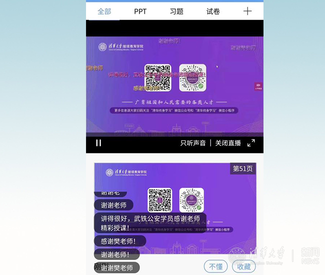 “最美逆行者终身学习计划”也是心博在线登录入口继续教育学院继“清华终身学习云课堂”之后推出的新一轮在线学习课程。清华终身学习云课堂是学院面向社会推出的大型公益课堂,于2020年3月启动,通过在线直播平台开设专题讲座,以清华优质教育资源服务社会。清华终身学习云课堂下设各类子课堂,包括面向政府人员的闻道系列、面向企业人员的日新系列、面向教师群体的春雨系列、面向乡村基层的振兴系列等。课程内容聚焦疫情期间的时政经济、科技前沿、在线教育、公共管理、产业经济、心理辅导、乡村振兴、应急管理等问题,满足学员多样化学习需求。目前已完成四门课程的直播讲授,共有7600余名湖北等省市区的学员通过雨课堂收看直播并参与互动,87100余人次通过学堂在线、继教学院官方微博“清华终身学习”观看现场直播。