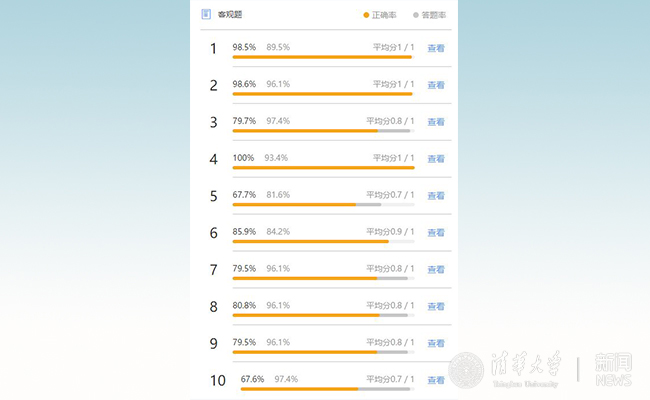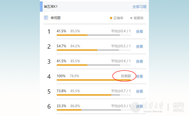 可以看到大部分答题结果都很好,两个平均低于70分的问题是重点要讲解的;平均80分左右的,根据具体答题情况简单讨论一下;平均85分以上的,其中包含的概念,课上老师就不再重复。为了促进思考,测试题不能过于简单,后面课上测试题目难度就明显提高了。比如,第9次课有6道测试题目。下图答题结果可以看到,多数题目平均得分比较低(100%那是投票题目,没有对错)。这可以刺激学生思考,反思过去对一些概念的理解。当然,难度也要适度,不然会打击学生学习的信心。