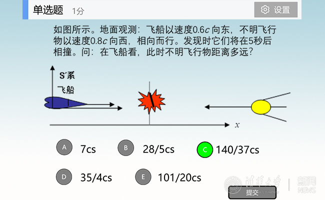 具体应该怎样设计测试题目呢?比如相对论里面的一个测试题目(如下图)。这个题目中除了正确的C选项,其余4个选项都对应某种错误,也就是说,对概念的不同错误理解会导致其余4个错误选项。