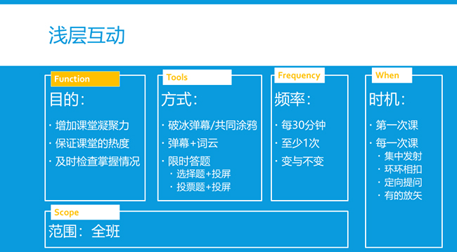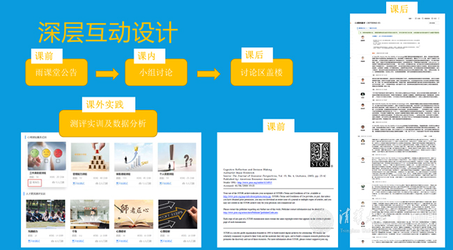 深层互动相比耗时更长,这里更长的时间主要是留给学生思考的时间,并且也给学生更长的时间用来讨论和表达。深层互动是由教师引发的,学生自己主导的思维活动。深层互动会保持学生个体头脑的热度。常用的方式有小组讨论、课后的思考题以及讨论区交流、小组作业等。深层互动的设计要考虑到更大的时间尺度,一个概念、一个理论或一个话题可以通过深层互动设计在一学期的不同章节中反复出现,逐层深入,通过增加学生的“输出”,把被动学习转化为主动学习。”