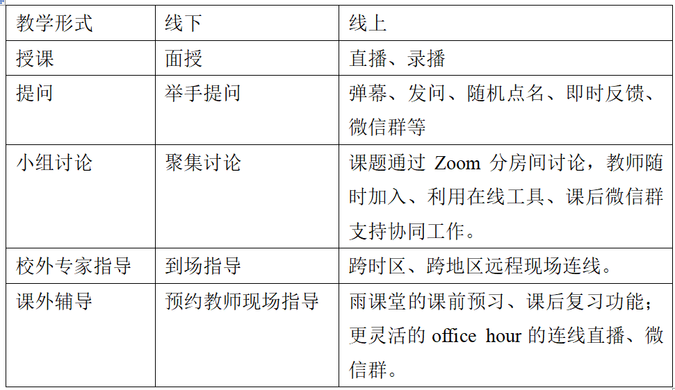 从能力培养的角度,课程需要培养学生的机会识别、设计思维、整合实现、团队执行的能力,通过发挥不同平台的特点,提供更多线上的手段,达成了教学的目标。教师也增加了分组指导的频率,采用电子白板等方式支持可视化讨论。