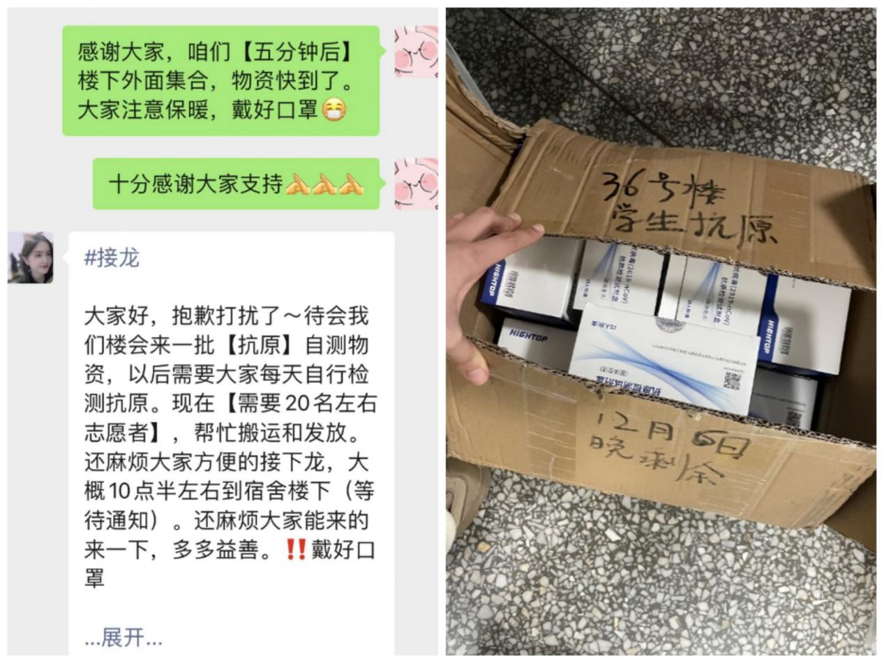 21时51分,新硕221党支部书记赵佳得知自己将担任楼宇联系人。她在新闻学院互助群里召集了20多名志愿者,整栋楼六个楼层,每层四人,东西两侧挨个宿舍敲门发放。22时50分左右收到物资,23时30分左右分发完毕。“我们用腾讯在线文档记录每个宿舍发了多少试剂盒,同时回应大家的疑问。”赵佳说。