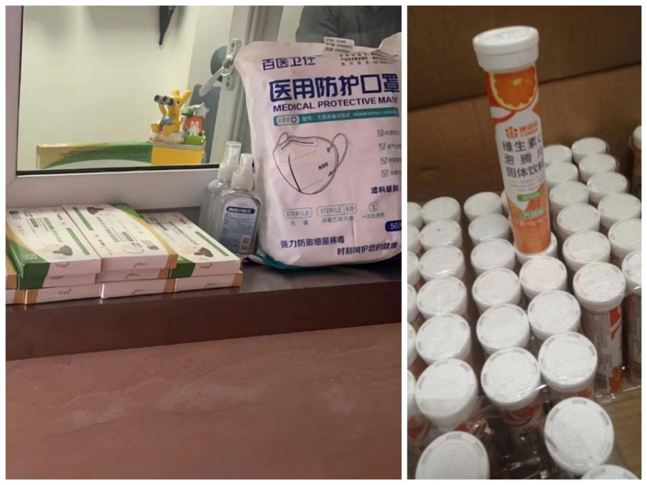 在学生骨干调研了在校同学对防疫物资和药品的需求后,院办陶芸老师进行统一采购。目前学院储备了N95口罩、抗原试剂盒、维C泡腾片、小瓶酒精和消毒水,摆放在未来媒体实验室值班室窗口前,由同学们自行取用。