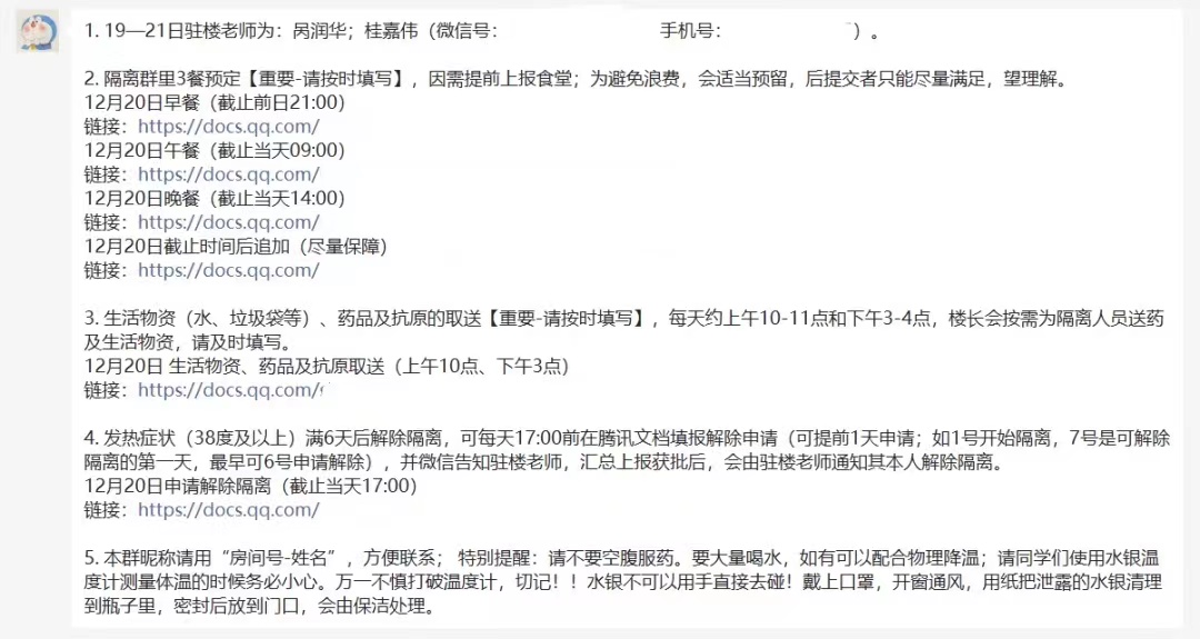 在此期间,张亚朋和曾姝也感染了病毒,但他们依然在线上承担信息统计等工作。他们说,虽然自己身体不适,但如果在此时更换信息统计志愿者,新的志愿者可能因为不熟悉楼内情况,需要一段时间适应岗位,会耽搁服务同学的进度。