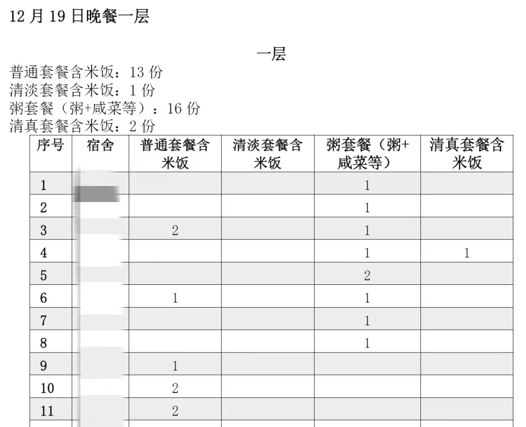 在接到招募志愿者信息后,土硕22党支部党员张亚朋和土博22党支部党员曾姝迅速报名,加入到志愿队伍中,负责28号楼信息统计和药物领取分发的工作。他们刚接手工作,便赶上了楼内新增阳性数量快速增加的情况,相关工作面临巨大的挑战。一方面,新入群的阳性同学尚不了解上报信息的操作流程;另一方面,群内同学各种需求信息繁杂,难以及时进行统计,给物资订购和分发工作造成较大的困难。两位志愿者通过与驻楼老师讨论,制定了系统性的解决办法:首先,针对同学们的差异化需求,他们设置了多个在线表格进行统计并每日更新;其次,他们每日多次在群内提醒同学们并设置临时追加表格,力求不落下楼内任何一位同学;最后,为了方便驻楼老师和志愿者分发餐食,他们将同学们的订饭信息分楼层、分餐食、分时段细心整理,打印成易懂的分餐表格,极大地减少了志愿者们的分餐压力。