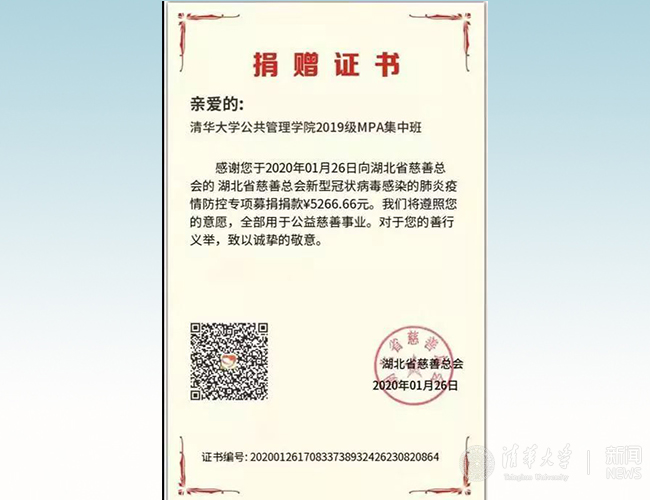听闻武汉及湖北多地疫情防控物资不足的严峻局面,公管人积极响应党和政府的号召,共抗疫情。1月26日,2019级MPA集中班临时党支部经过商讨,向全班同学发出募捐倡议,为战胜疫情贡献自己的力量。募捐以个人自愿为原则,金额不限。经过一天的募捐,共筹集到善款5266.66元。加上之前有同学以个人名义捐助的1000元,共计6266.66元。筹集的善款以“心博在线登录入口公共管理学院2019级MPA集中班”的名义,捐赠给湖北省慈善总会“新型冠状病毒感染的肺炎疫情防控专项募捐”项目,充分体现了公管人的使命和担当。
