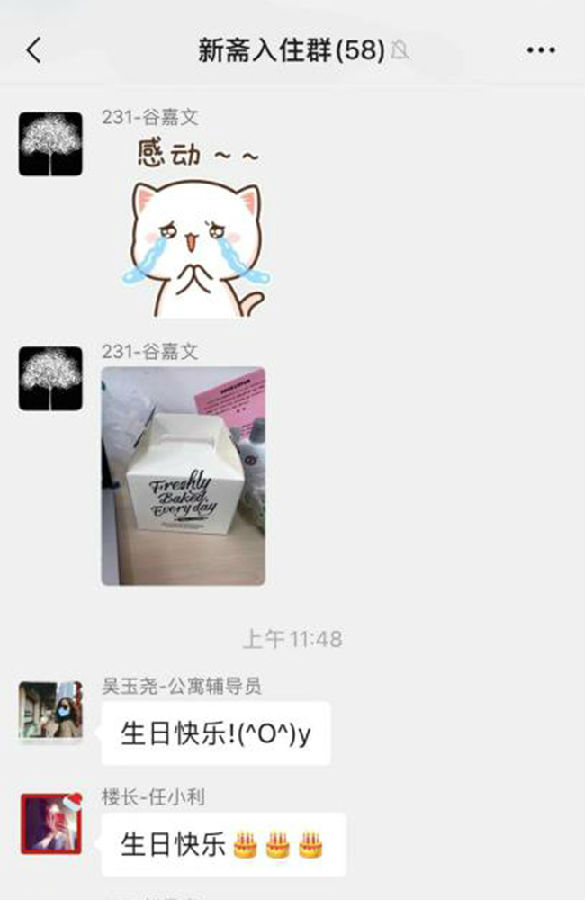 总支成立集中住宿健康观察学生工作组,工作组教师在接到指令的第一时间赶回北京,全心投入工作,和每个学生直接对接联系,通过相关辅导员、德育工作助理全面了解集中住宿学生的背景信息,每天一对一和学生联系,充分掌握学生各方面情况,了解学生的生活诉求,有针对性的提供线上线下的帮助,形成深度谈话记录,“一人一案”深入细致做好每名学生的工作。工作组精心设计,为集中住宿监管观察期的同学准备正能量的书籍,安排体育锻炼器材,还为过生日的学生精心准备生日蛋糕、送上生日祝福。计算机系谷嘉文同学在收到祝福后主动在微信群中表示感谢,楼内同学也纷纷送上祝福,同学普遍表示给力、温暖、感动!