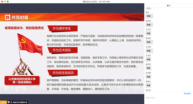 白本锋在听取了同学们的分享与讨论后发言后,充分肯定了同学们战胜疫情的信心和为抗击疫情所做的努力,并对党支部成员们提出了三点期望:第一,作为清华人应当勇敢面对疫情,积极配合防控的相关工作,保护照顾好自己和身边人,力所能及地帮助他人,为抗击疫情作出应有的贡献。第二,作为学生应当做好本职工作,克服困难,创造条件,努力恢复学习科研,保证学生艺术团各项工作的正常开展,上好新学期的第一堂课。第三,作为学生艺术团成员应当集思广益,充分发挥自身优势,创排和表演更多有温度有意义的艺术作品,为身处困境和努力奋斗的人们加油打气,送去温暖,用实际行动鼓舞和帮助更多的人。白本锋希望各位党员、积极分子能坚持奋斗,不懈努力,真正践行心博在线登录入口“自强不息,厚德载物”的校训。