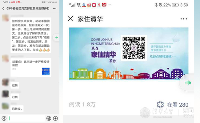 “动动手指就是志愿服务”,报到党员通过关注并转发清华园街道“家住清华”等公众号的文章,广泛普及防控知识,引导居民科学防控,克服焦虑心理,不信谣、不造谣、不传谣,正确理性看待疫情,增强自我防范意识和防护能力,支持配合各项防控要求。“家住清华”关于推广“一米线”的文章,经报到党员广泛积极宣传,2天内阅读量超过7000人次;关于“疫情防控常识”的文章,阅读量达6000余人次;关于“疫情防控不获全胜决不轻言成功”的文章10小时内超过1.7万人次阅读。在党员们的转发下,这些科普知识得以让更多人了解学习,达到了良好的宣传效果,为辖区居民科学防控、理性防控、依法防控发挥了积极作用。