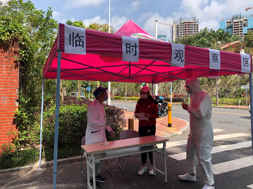 在体温检测中,一名入校学生模拟出现发热情况,研工办工作人员立刻将该生引导至校门外的临时隔离点,并联系社康中心工作人员到场。社康中心工作人员到场后对该生进行体温复查、初步排查随后联系120将该生送到指定医院。在临时隔离点,研工办人员对该生进行了信息登记,心理中心工作人员对该生进行心理安抚,并将情况及时向院应急领导小组报告。