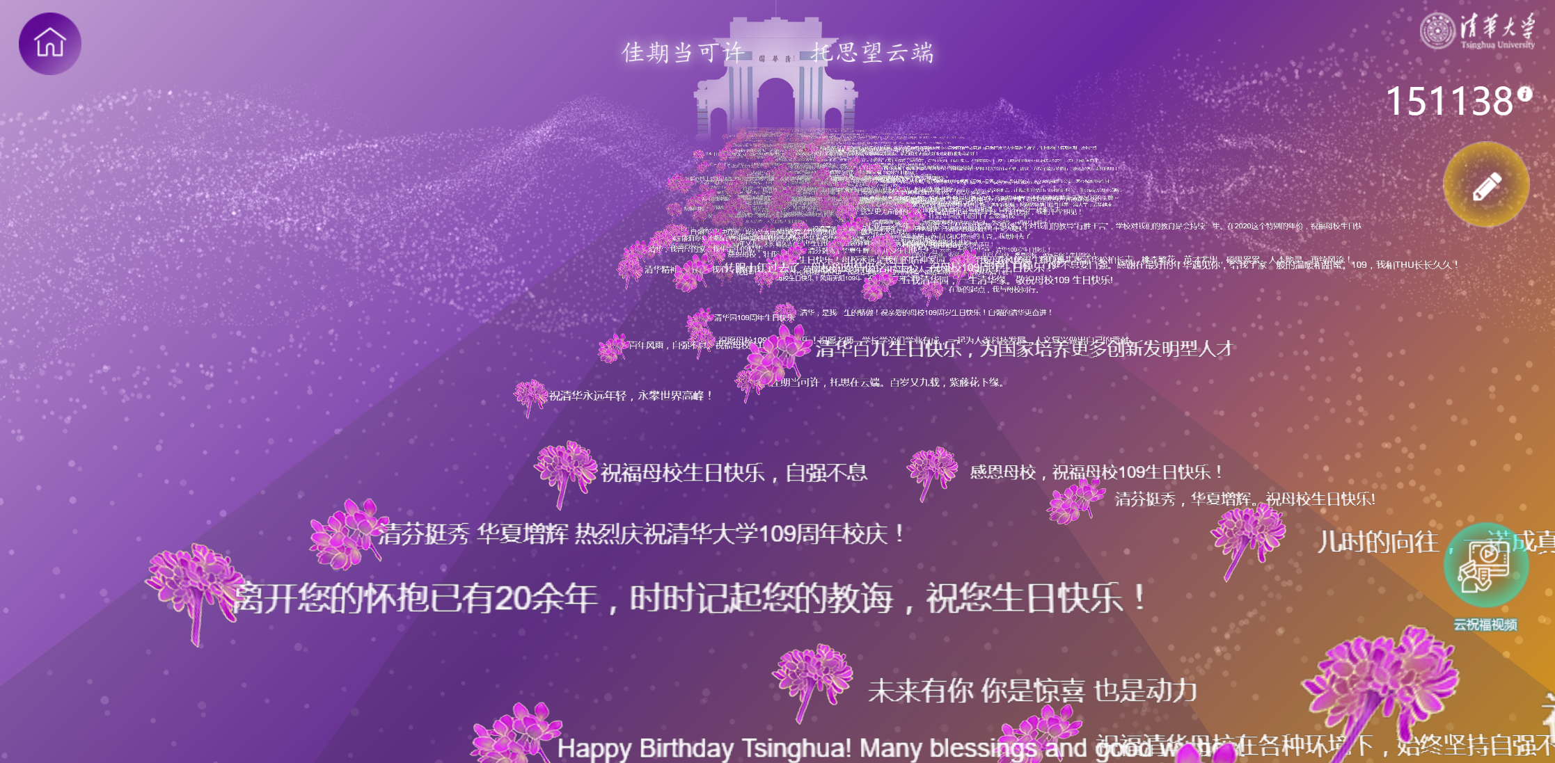 打开校庆专题网站祝福页面,仿佛打开了一扇通往二校门的星球宇宙,每朵紫荆花的背后都是深深的祝福与期盼,满满的是对水木清华的思念和向往。