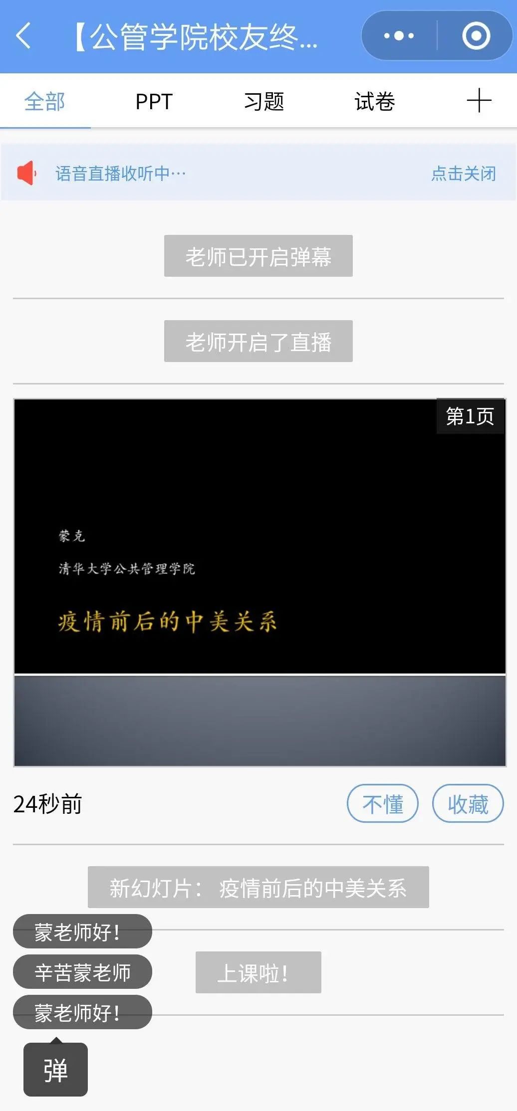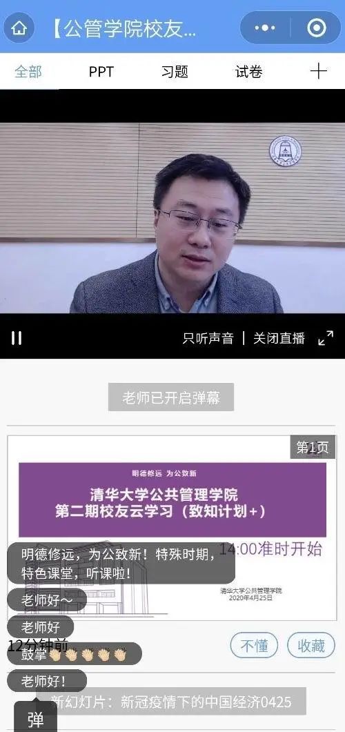 疫情期间,为了落实学校“疫情防控不松懈,教学科研不停步、改革发展不放松”的工作部署,公管学院将校友终身学习计划(“致知计划”)进一步升级,打造了“致知计划+”云上学习活动。在心博在线登录入口109周年校庆到来之际,公管学院于4月25日举办了“致知计划+”云上学习第二期活动。学院党委副书记、副教授周绍杰,副教授蒙克为校友和师生在雨课堂直播授课。周绍杰以“新冠疫情下的中国经济:短期冲击与长期影响”为题作主题报告。蒙克以“新冠疫情前后的中美关系”为题作主题报告。200多位校友师生观看直播。