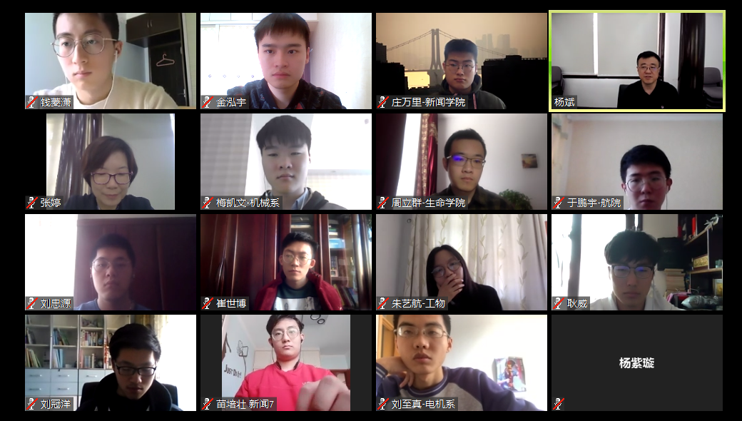 首页网5月6日电 4月29日下午,副校长杨斌与来自机械系、生命学院、新闻学院等院系的13位在学校或院系学生会工作的同学,以线上视频会议的方式,开展了主题为“以生活而教育,因疫情而成长”的“开放交流时间”活动。校团委书记张婷参加活动。师生围绕疫情期间在家学习的感受和体验,畅谈这段“全民抗疫”特殊时光中的生活与成长。