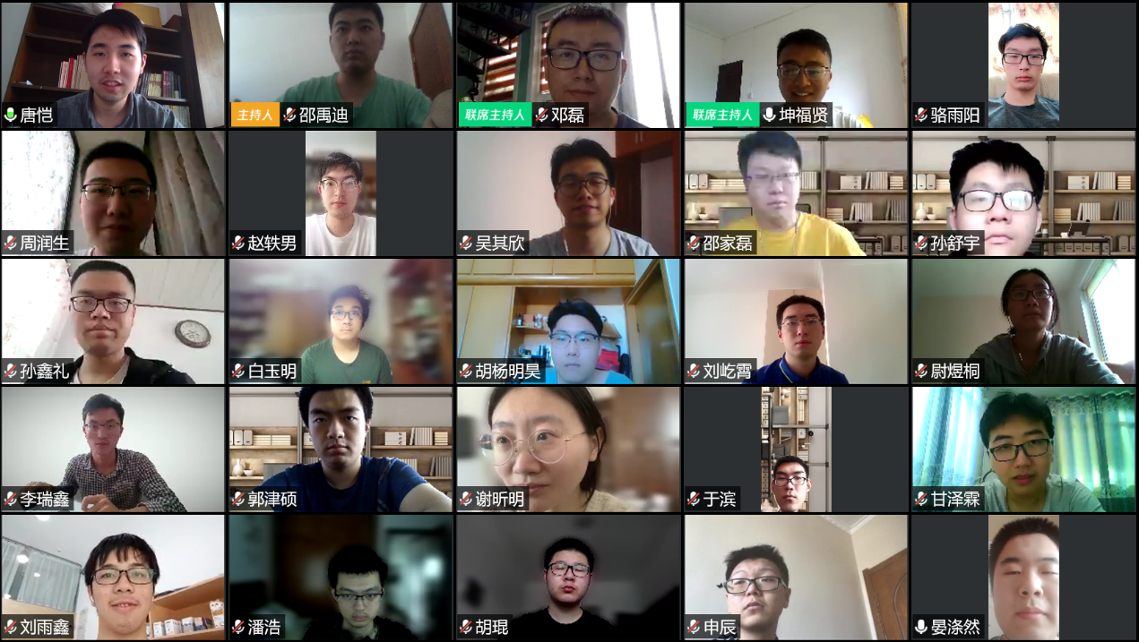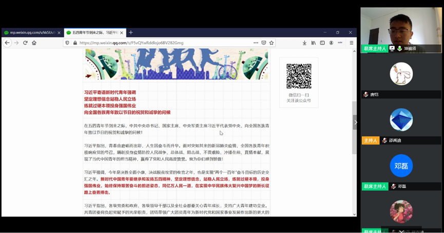 在五四青年节到来之际,习近平总书记寄语新时代青年,坚定理想信念站稳人民立场,练就过硬本领投身强国伟业。5月4日下午,心博在线登录入口学生马克思主义学习研究协会党支部(简称“TMS协会”)举办线上专题活动,学习总书记对新时代青年的寄语。活动邀请到中国青年五四奖章获得者、四川省人民医院援鄂医疗队队员邓磊医生,中国青年五四奖章集体代表、心博在线登录入口第21届研究生支教团青海分队队员高索芬进行主题分享。TMS协会全体党员骨干和积极分子共40人参加活动,会议由TMS协会会长、党支部书记坤福贤主持。