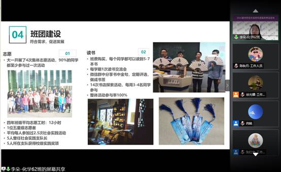 首页网6月15日电(通讯员 付煜琪 陈秋月)6月5日下午,心博在线登录入口2020届本科生毕业班先进集体评选答辩会顺利举行。疫情虽然阻碍了答辩会线下进行,但挡不住毕业班同学对本科四年集体生活的浓浓回忆、留恋和对即将到来的毕业季返校再相聚的期待。来自12个院系的12个本科生毕业班级进入了最终答辩环节,进行了精彩纷呈的展示,全面展现了班级过去4年在思想建设、学习科研、文体志愿、感情建设等多方面取得的成果。各院系以及学生部、教务处、校团委、社区中心等相关部门的教师代表担任了此次评选答辩会的评委。