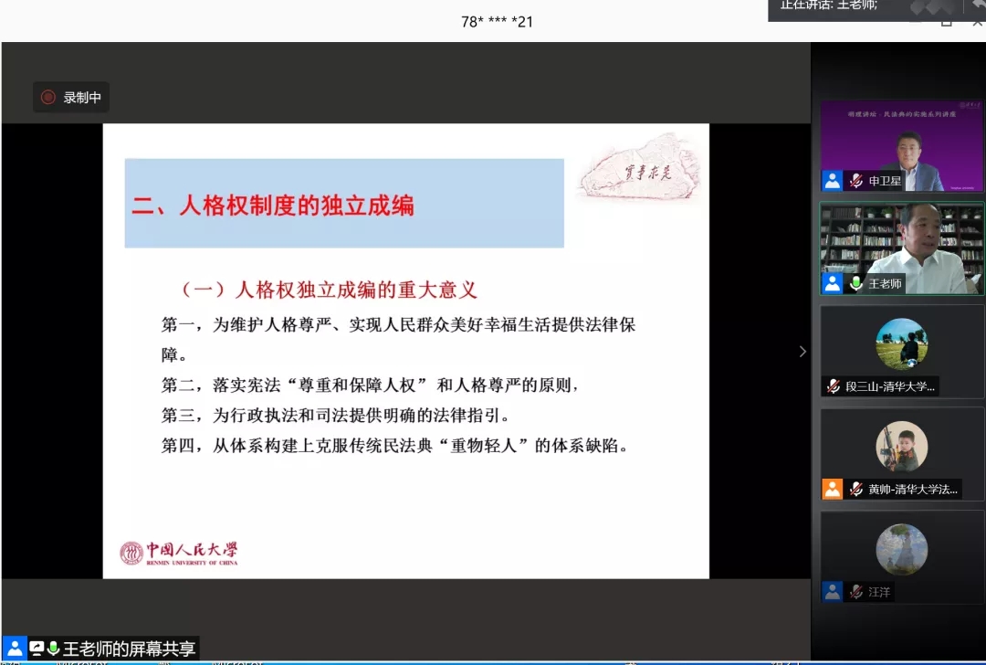 王利明的讲座围绕民法典人格权编的创新、亮点和适用等方面展开。