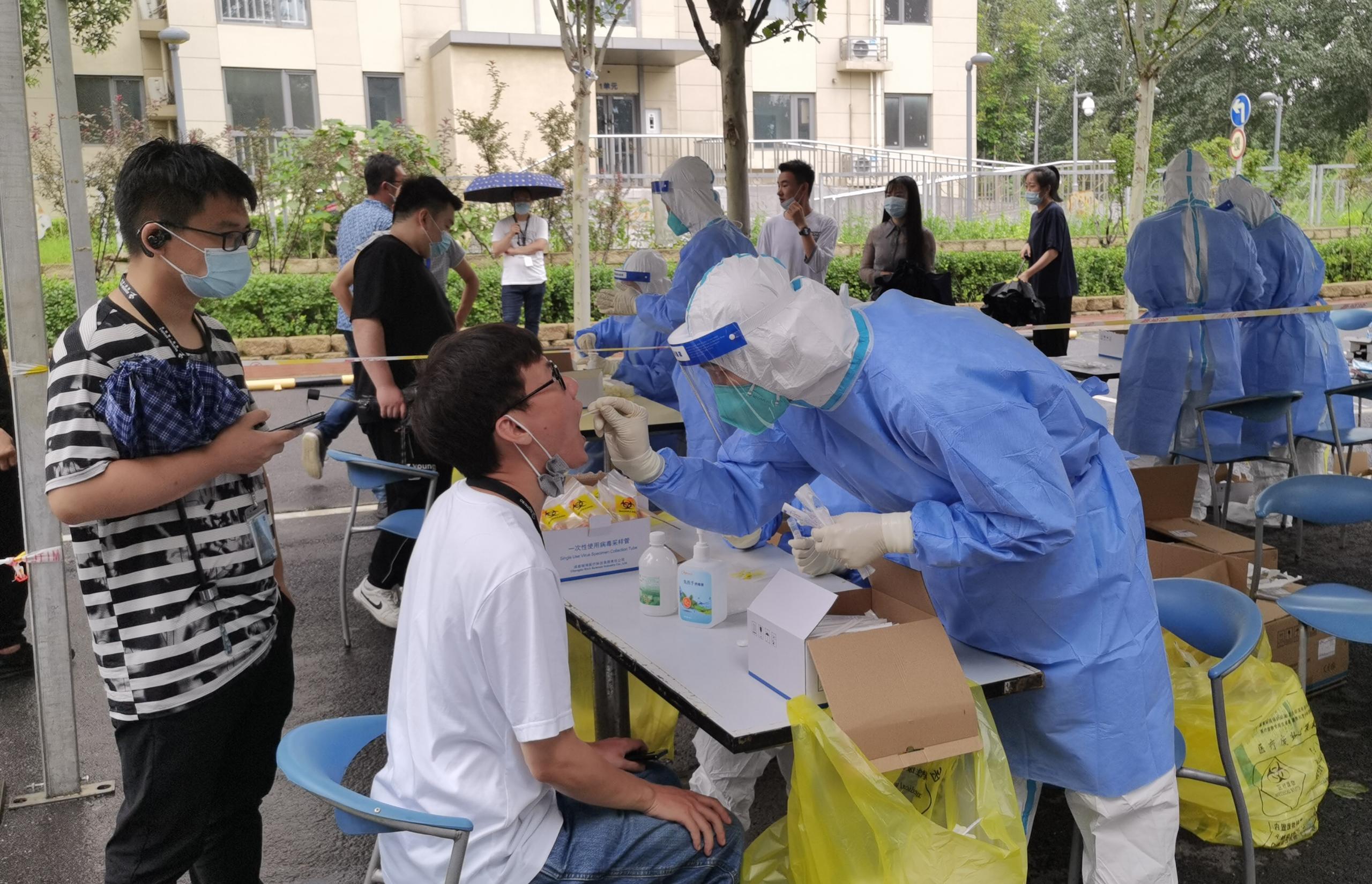 到达现场后,支援队伍分组后前往3个检测点进行采样。潮热的雨天为采集工作增加了难度,医护人员身着厚重的防护服,内里的衣服很快就被汗水湿透,每一个人都坚守在自己的岗位上,有条不紊地为民众进行采样。“有很多同事刚下夜班就赶过来了,真的非常辛苦。”辛扬眉说道,“但我们多数人员都经历了去年三伏和三九支援的锻炼,现场没有一个人喊累,都希望能通过自己的努力,为疫情防控作贡献。”