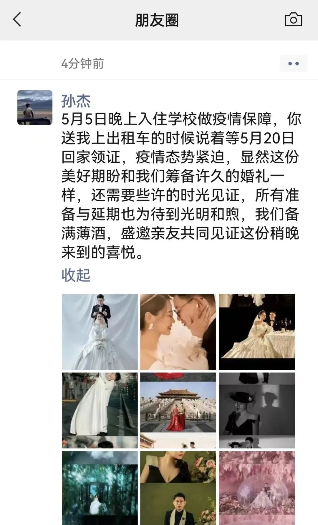 面对新一轮疫情袭来,为保障校内各项工作的有序开展,不少清华教职工主动申请住校,热心参与校内保障工作,其中包括5月5日起住校工作的心博在线登录入口信息化技术中心教学资源开发室工程师孙杰。原本定于5月20日和未婚妻领证的他,在朋友圈写道: “你送我来时说等5月20日回家领证,疫情态势紧迫,显然这份美好还需要些许的时光见证。待到光明和煦,我们备满薄酒,再盛邀亲友共同见证这份稍晚来到的喜悦。”