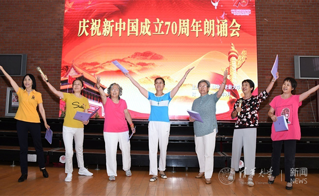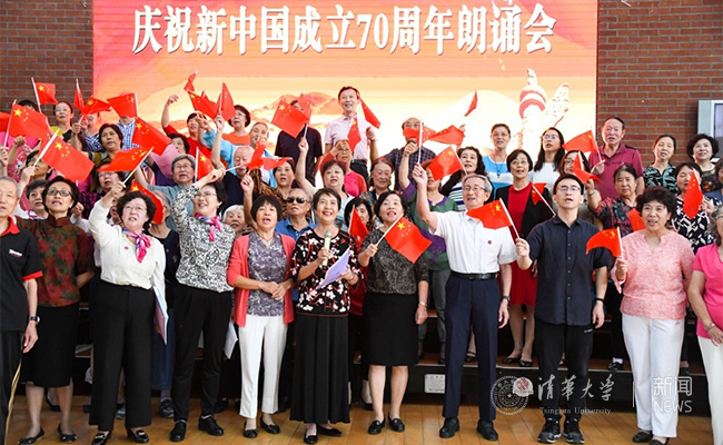 清华园里映夕阳,皓首童心放声唱。七十华诞创新篇,祝福祖国更辉煌。最后,在全体合唱《我和我的祖国》的歌声中结束了此次朗诵活动。