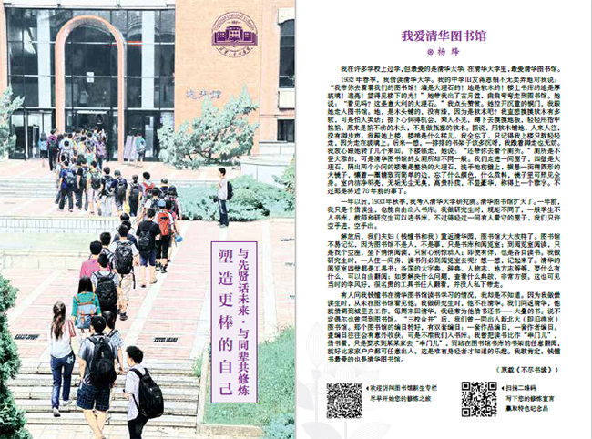 书香润清华,开卷益青春。静下心来读一本好书,添一份雅趣,长一份才智,享一份快乐。我们将在阅读中重新发现自己,这正是“人文日新”的真义。