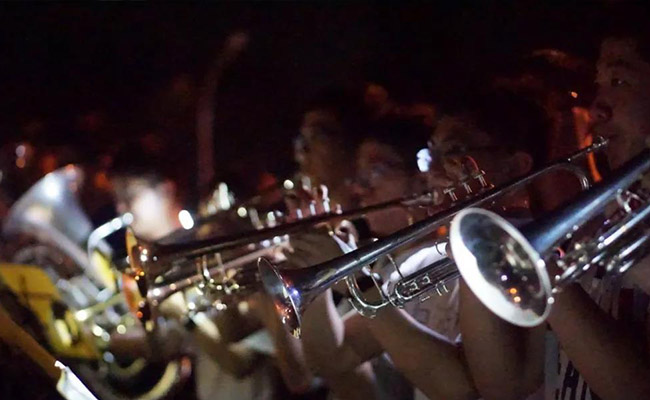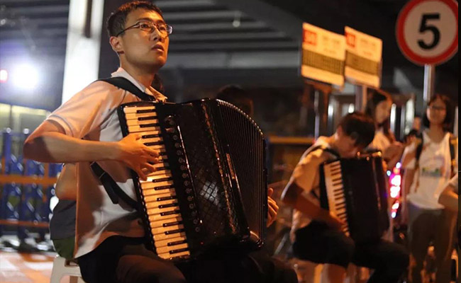 行过天桥,艺术团演奏的乐曲驱散了夜晚的疲惫。