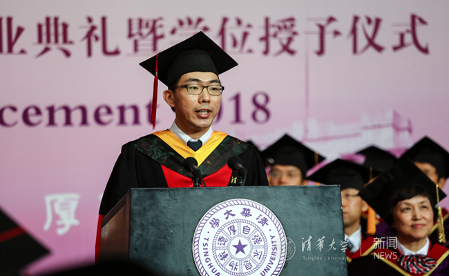 此时此刻,请允许我代表2018届全体研究生毕业生们向学校和师长们表达最真挚的谢意。感谢芳华正茂、人文日新的清华园,为我们不断营造更好的学习氛围与生活环境;感谢身正学高、春风化雨的师长们,在我们人生前进的道路上指点迷津、引领方向;感谢志向高远、携手共进的同窗们,有你们一路同行奋斗的青春才更有激情;感谢默默奉献、坚定支持的家人们,是你们给予了我们无畏前行的力量。而我,还要特别感谢在学生时代尾巴上邂逅的一段美好的校园爱情,使我今天能够在妻子的陪伴下参加毕业典礼,还能够实现抱娃参加博士答辩的小梦想。