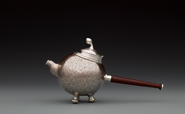 制作伊始,工艺的难度在于整体器型的锻敲。器型的造型整体较为奔放,金属胎体表面会有起伏较大的褶皱,将平整的银片锻敲收至合适的高度后,先将器型分为几块比较大的体面,在铁砧上按照画好的体面分别再沿中间向两侧收小,收完一遍后用长头锤从壶的内侧向外顶,一遍过后可以看到每个分瓣已经有了大型。