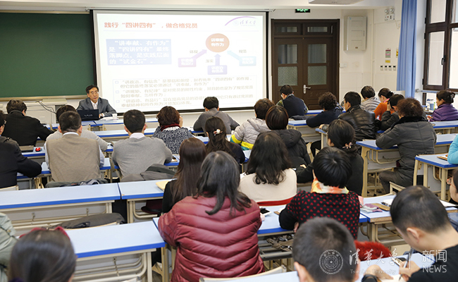 姜胜耀首先从四个方面深入阐述了“讲奉献、有作为”的深刻内涵,指出“讲奉献,有作为”是我党“全心全意为人民服务”根本宗旨的集中体现。他回顾了“全心全意为人民服务”这一宗旨的产生过程和我党95年的奋斗历程,指出共产党人的“讲奉献、有作为”就是为了人民去无私奉献、去不懈奋斗,顺应人民群众对美好生活的向往,使改革发展成果更多更公平惠及全体人民,不断把为人民造福事业推向前进。党课中,姜胜耀带领大家通过学习党章党规和习近平总书记系列重要讲话,并结合十八届六中全会精神系统学习了“讲奉献、有作为”的相关要求。同时,他从清华的百余年发展历程和形成的优良传统等角度入手,诠释了“爱国奉献、追求卓越”的清华精神和“讲奉献、有作为”的内在联系。
