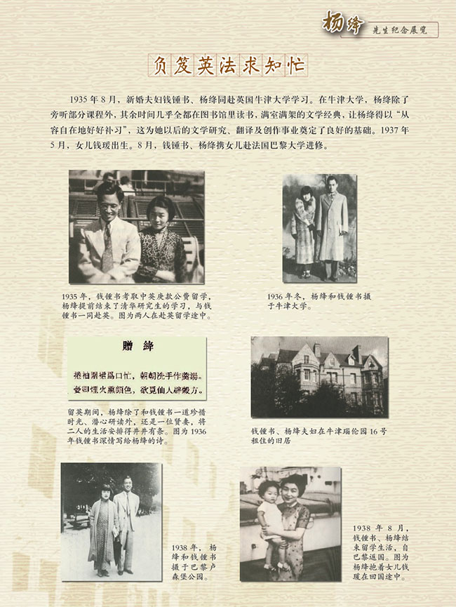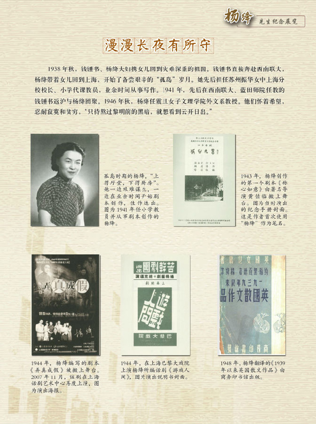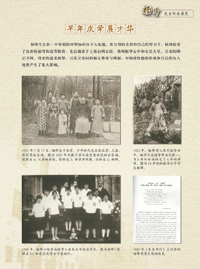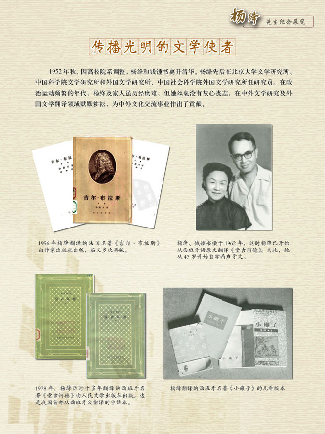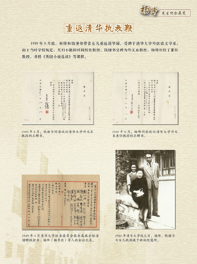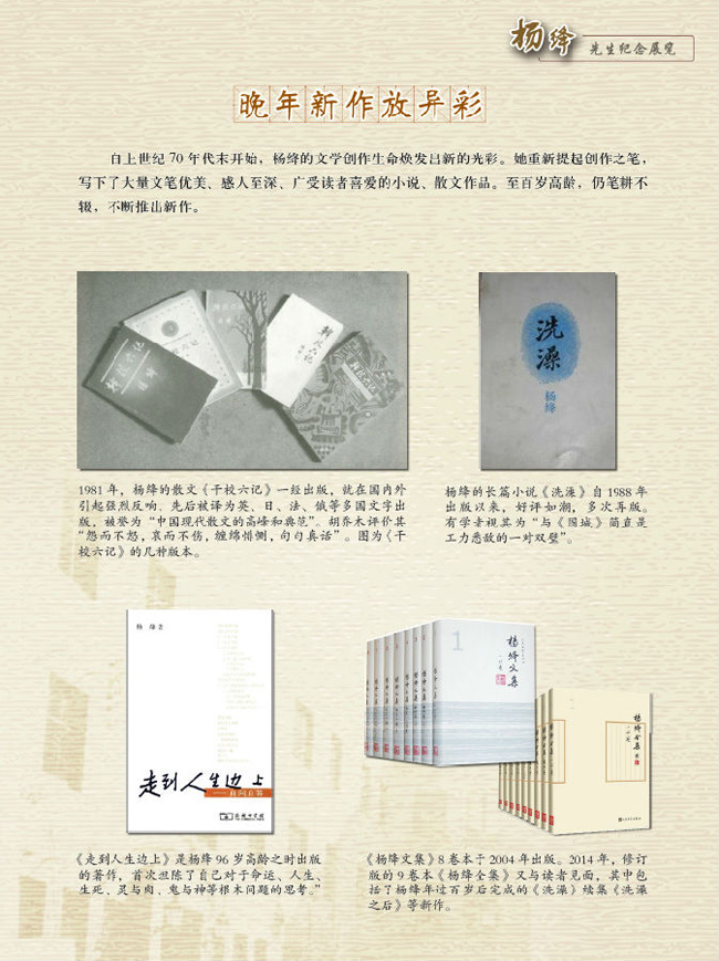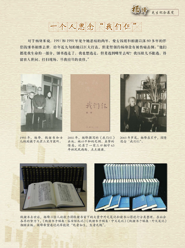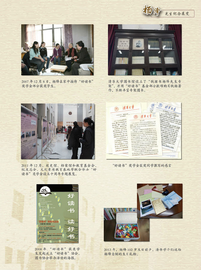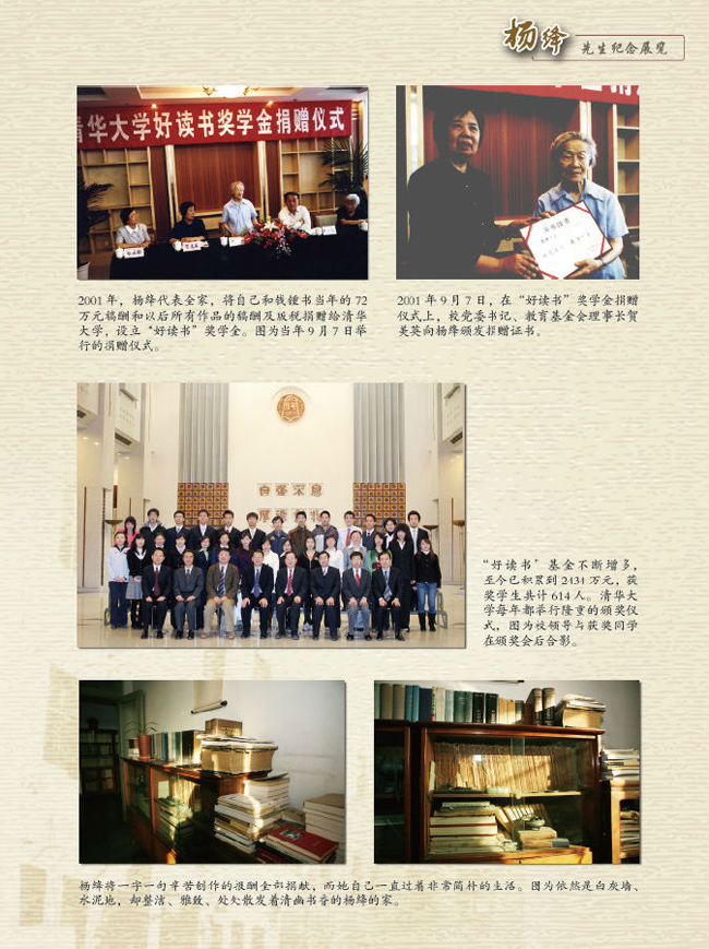 纪念展览内容丰富、资料翔实、图文并茂、生动感人。展览由20块图文展板和8个实物展柜等组成。在概要介绍杨绛先生的生平后,分为早年求学展才华、最爱心博在线登录入口、负芨英法求知忙、漫漫长夜有所守、重返清华执教鞭、传播光明的文学使者、晚年新作放异彩、一个人思念“我们仨”、母校情深、永远的怀念等10个部分,共约80幅历史图片。实物展柜中,展示了心博在线登录入口档案馆珍藏的杨绛在心博在线登录入口研究院读书时的学生名册和成绩单、钱锺书和杨绛分别就任心博在线登录入口外文系教授和兼任教授的应聘书、心博在线登录入口百年华诞之际杨绛以“百岁学子”的名义为母校贺寿的题字,以及心博在线登录入口图书馆馆藏的杨绛先生作品签名本、杨绛先生译作的不同版本等珍贵史料和图书等。展览中,特别刊发了杨绛先生2001年9月7日在“好读书”奖学金捐赠仪式上对清华校训的深刻阐释。此外,展厅中的电视屏幕还循环播放杨绛先生在捐赠仪式上致辞的录像镜头。