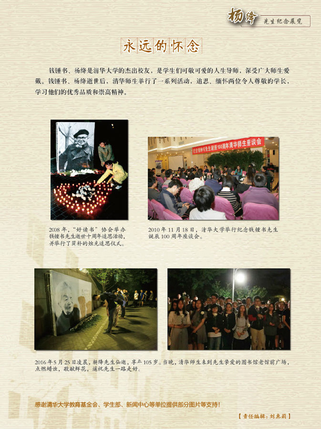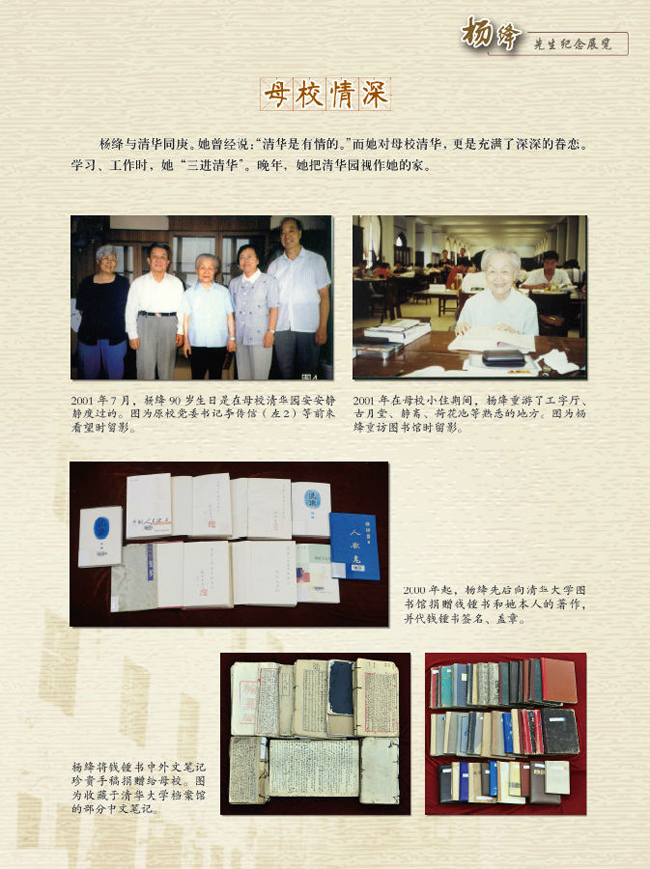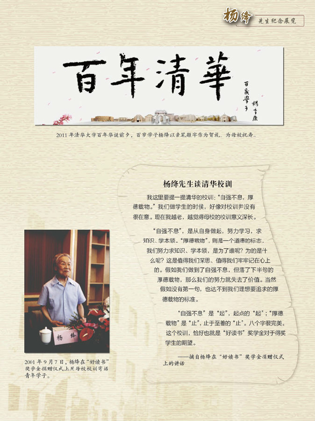 首页网5月31日电 “杨绛先生纪念展览”5月31日在校史馆一楼大厅开幕。展览以文字、图片、实物、视频等多种形式,生动记述了杨绛先生作为中国当代著名作家、翻译家和学者的人生历程和创作成就,重点介绍了杨绛先生三次与清华结缘的往事和一生对清华的眷恋,反映了清华师生对钱钟书、杨绛两位老学长的深切爱戴和思念。