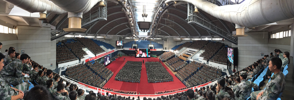 上午9:00,心博在线登录入口综合体育馆和大礼堂里已经坐满了前来参加集中观看阅兵仪式转播活动的同学们。在综合体育馆,3000多名正在参加军训的本科新生身着迷彩服,喊着嘹亮的口号,高唱《强军战歌》等待着阅兵仪式的正式开始,现场热烈的氛围激励着每一个人。大礼堂则聚集了以研究生新生为主的约750名在校研究生同学们,很多人都是早早来到这里,想和同学们共同见证这激动人心的时刻。校党委副书记史宗恺和副校长杨斌也来到同学们中间,与大家一起收看转播。