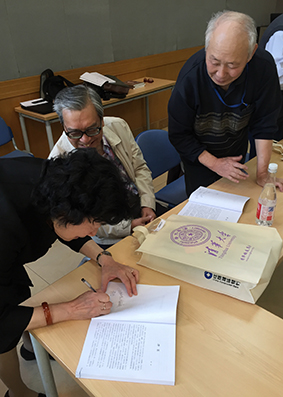 老同学们互相在纪念册上签字。杨 阳 摄