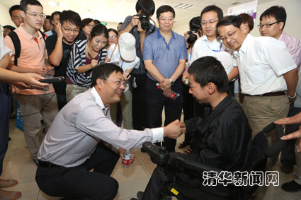 图为校长陈吉宁蹲下身来与矣晓沅握手,鼓励他在清华园里健康成长。记者 智 斐 摄
