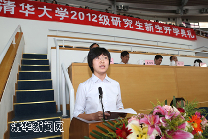校研究生会主席、电子系2008级博士生余潇潇代表全体在读研究生和校研究生会向2012级新同学表示欢迎。她与新生们分享了清华的历史和文化底蕴、大师的奋斗风采以及对清华的感悟。她希望新生们珍惜青春,做一个踏实肯干、敢于担当、追求卓越、勇于奉献的清华人。