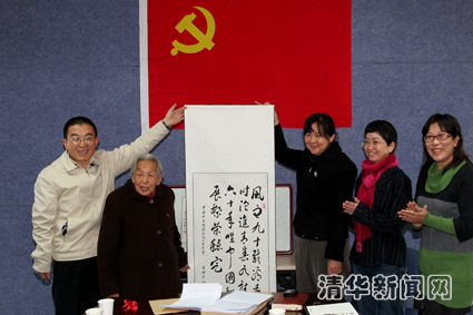 图为白颖仁(左二)向党组织送上自己的书法作品。记者 郭海军 摄