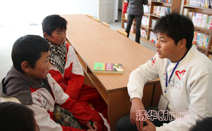 图为李博洋与关爱农民工子女志愿服务行动中结对帮扶的几个牧区孩子在新建的爱心图书室里交流。