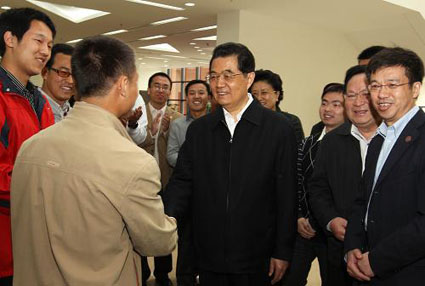 图为胡锦涛在校史馆同部分将到边远地区和国防建设一线工作的应届毕业生亲切交谈。新华社记者兰红光摄