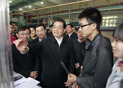 胡锦涛总书记沿扶梯走上实验平台时,正在水垫塘旁进行实验的师生们热烈鼓掌。令他们意想不到的是,总书记竟然半蹲下来,一直面带笑容和同学们握手,向大家问好。师生齐声高喊:“胡总书记好!”2010级硕士生刘彧说,能和总书记握手同学们都很高兴,这个细节更让他们十分感动。