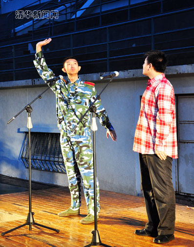 9月6日晚6点,军训一营整齐地来到了东大操场,新生同学们自带板凳有序地坐好。曲艺队的第一场慰问演出拉开了帷幕,整场演出始终围绕军训主题与“清华精神”的主线,从多方面反映了清华学生的生活与思想。曲艺队原创的校园相声《军训记》与《装小嘴》相继登场,根据清华校园文化改编的传统相声《学电台》和《三打白骨精》等快板书节目也精彩上演,全面地展现了清华学生的艺术风采。