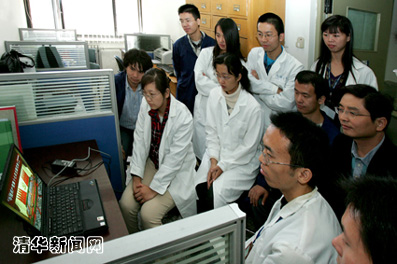 在材料系的实验室,材料系党委副书记汪长安和穿着工作服的06级硕士通过清华博学网一起聆听胡锦涛总书记的报告。在听到精彩处,大家不时报以热烈掌声,有同学还把报告中的重要内容记录在笔记本上。硕06党支部书记刘人淼说:在我们熟悉的实验室里观看“十七大”开幕式意义非常。我们以后将做好本职工作,把自身发展和国家的发展紧密联系在一起,为全面建设小康社会做出自己的贡献。
