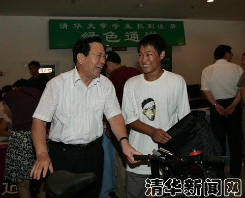 在“绿色通道”,校领导询问了新生领取临时贷学金的情况,顾秉林、陈希、汪劲松、陈旭还亲手将学校为家庭经济困难学生准备的被褥、书包和自行车送到了材料系的河南新生王保民和精仪系的广西新生韦文鸿手里。