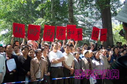 在东西主干道上,迎着宋主席一行车队的方向,30多名清华学生手持自制的“期盼两岸和平统一”的纸牌标语,列队欢迎宋主席一行的到来。在二校门西侧的一教前、二校门北面小桥,一个多小时前就自发聚集在这里的上千名欢迎的师生兴奋地鼓掌欢呼。