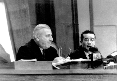 1964年梅汝璈法官(右 1924年清华学校毕业)与韦伯庭长在远东国际军事法庭审判席上