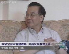 温家宝总理与教师亲切交谈 CCTV.com消息(新闻联播):在第20个教师节即将到来之际,中共中央政治局常委、国务院总理温家宝利用周末时间看望在京的几位教师,就如何发展教育事业问题与他们促膝谈心,听取他们的意见和建议,并代表党中央、国务院向全国一千多万辛勤耕耘的教师和教育工作者表示节日的祝贺。