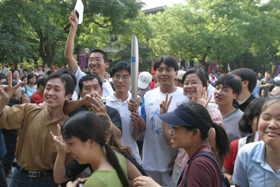 【新闻中心讯 记者 周襄楠 摄影 郭海军】“我摸到了火炬!”医学院的本科同学小李异常高兴得对我说,尽管由于酷暑他脸上的汗水模糊了他画在脸上的国旗。由于他们班同学在二校门内的位置正好是火炬交接的位置,所以他们班很多同学得以幸运地在火炬交接的时候从撤下的火炬手手里摸到了火炬。